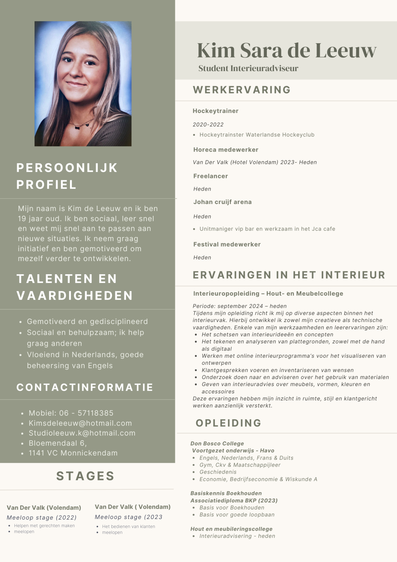 Hoi! Mijn naam is Kim de Leeuw en ik ben een enthousiaste interieuradviseur in opleiding aan het Hout- en Meubileringscollege (HMC). Ik ben 19 jaar en volg de versnelde opleiding, waarin ik me volledig richt op het ontwerpen van sfeervolle en functionele interieurs.